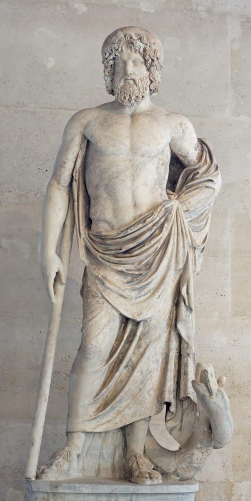 Statue en marbre d’Asclépios, dieu de la médecine. Copie romaine (IIe siècle de notre ère) d’un original grec de la première moitié du IVe siècle avant notre ère – Musée du Louvre, Paris. @Wikimedia commons