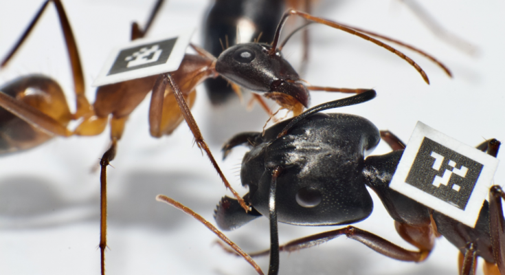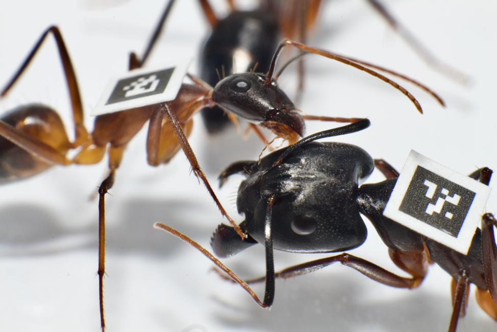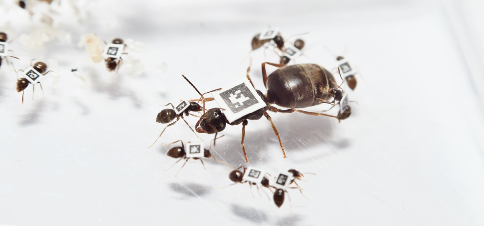 L’épidémie de COVID-19 nous a habitués au concept de distanciation sociale. Pour vérifier si l’interdiction des rassemblements de plus de cinq personnes étaient respectée, l’OFSP a demandé à Swisscom de surveiller les citoyens grâces aux signaux émis par leurs téléphones portables (1). Des études du même type avaient déjà été entreprises chez les fourmis par Dr. Nathalie Stroeymeyt et l’équipe du prof. Laurent Keller à l’Université de Lausanne. Dans une étude publiée dans la revue Science, les scientifiques ont utilisé des sortes codes-barres miniatures collés sur le dos des insectes (2) et un système de tracking automatique pour suivre les faits et gestes des fourmis après contamination de la colonie par un pathogène. Les scientifiques ont fait une observation intéressante : lorsque 10% des fourrageuses sont contaminées expérimentalement, elles s’isolent activement en restant plus souvent à l’extérieur de la colonie, et plus loin de celle-ci. Ceci est vrai pour les fourrageuses contaminées, mais aussi pour les non-contaminées. Les nourrices, non-contaminées, se rapprochent quant à elles plus près du couvain, qu’elles déplacent plus loin de l’entrée du nid. « Cette organisation sociale diminue la transmission des pathogènes car elle agit comme un sas en diminuant la probabilité de transmission entre groupes. », souligne Laurent Keller. Cette étude adonc permis de montrer qu’ aussi bien les fourmis non-contaminées que les contaminées sont capables d’ajuster leur comportement pour limiter la propagation d’un pathogène (2).